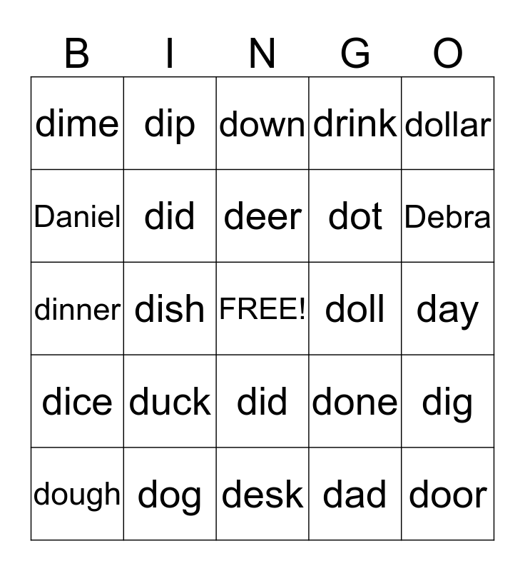 This bingo card has a free space and 24 words: duck, dog, deer, dough, dollar, dime, Daniel, dip, doll, did, dot, dinner, done, dig, did, dad, day, down, Debra, dish, door, dice, drink and desk.
