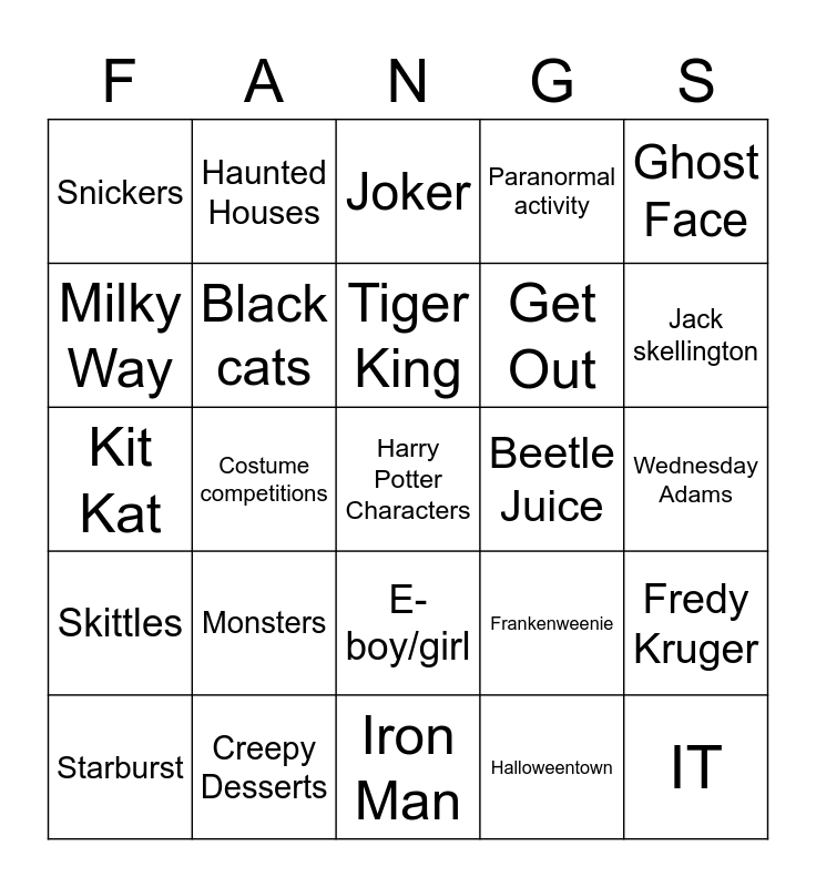 This bingo card has 35 words: Twix, Pumpkins, Bob Ross, Get Out, IT, Snickers, Black cats, Carole Baskin, Beetle Juice, Chucky, Kit Kat, Haunted Houses, E-boy/girl, Hocus Pocus, Ghost Face, Skittles, Creepy Desserts, Joker, Halloweentown, Wednesday Adams, Starburst, Costume competitions, Harry Potter Characters, The Nightmare Before Christmas, Jack skellington, Milky Way, Trick or treating, Iron Man, Frankenweenie, Fredy Kruger, Candy Corn, Monsters, Tiger King, Paranormal activity and Michael Myers.