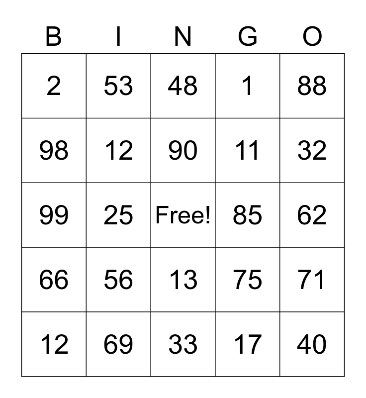 This bingo card has a free space and 24 words: 56, 69, 90, 12, 88, 2, 98, 53, 85, 13, 11, 99, 75, 71, 12, 17, 62, 48, 32, 25, 40, 66, 1 and 33.
