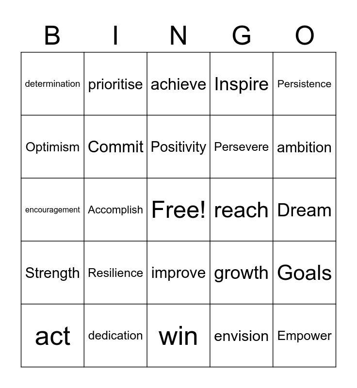 This bingo card has a free space and 38 words: Reward, Seek, Conquer, Commit, Goals, Resilience, Positivity, Believe, Persistence, Persevere, Accomplish, Inspire, Empower, Dream, Optimism, Strength, adventure, achieve, leader, reach, determination, dedication, ambition, act, create, win, desire, eager, pride, risks, challenge, improve, envision, prioritise, mind set, growth, encouragement and appreciation.