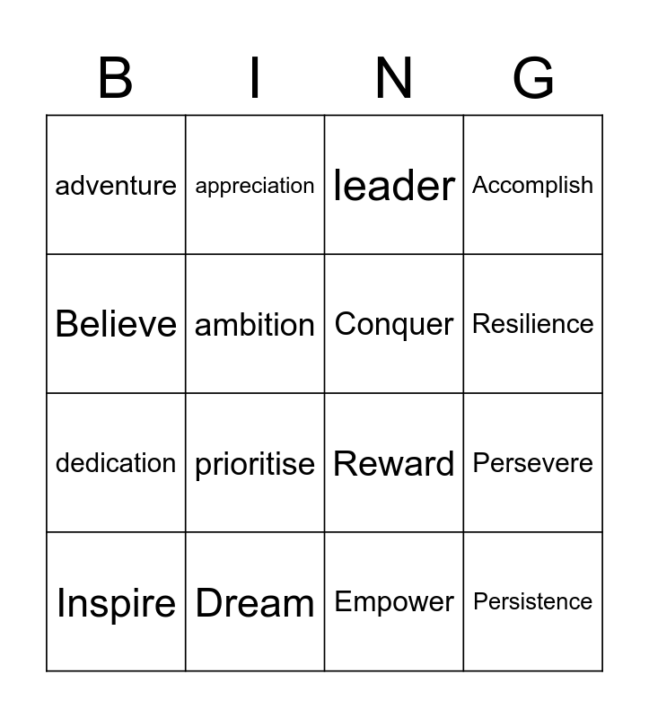 This bingo card has 40 words: think, Reward, Seek, Conquer, Commit, Goals, Resilience, Positivity, Believe, Persistence, Persevere, Accomplish, Inspire, Empower, Dream, Optimism, Strength, adventure, achieve, leader, reach, determination, dedication, ambition, act, create, win, desire, eager, pride, risks, challenge, improve, envision, prioritise, mind set, growth, encouragement, appreciation and think.