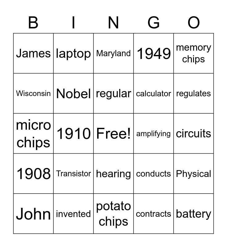 This bingo card has a free space and 29 words: John, Physicist, 1910, radios, James, Maryland, Nobel, Transistor, amplifying, invented, circuits, battery, potato chips, contracts, regulates, emitter, hearing, 1908, memory chips, micro chips, conducts, machine, calculator, Wisconsin, 1949, laptop, Physical, regular and circus.