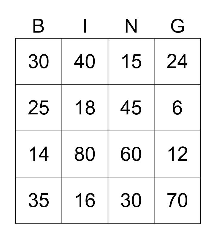 This bingo card has 16 words: 16, 12, 15, 30, 14, 40, 60, 30, 25, 18, 35, 24, 80, 6, 45 and 70.