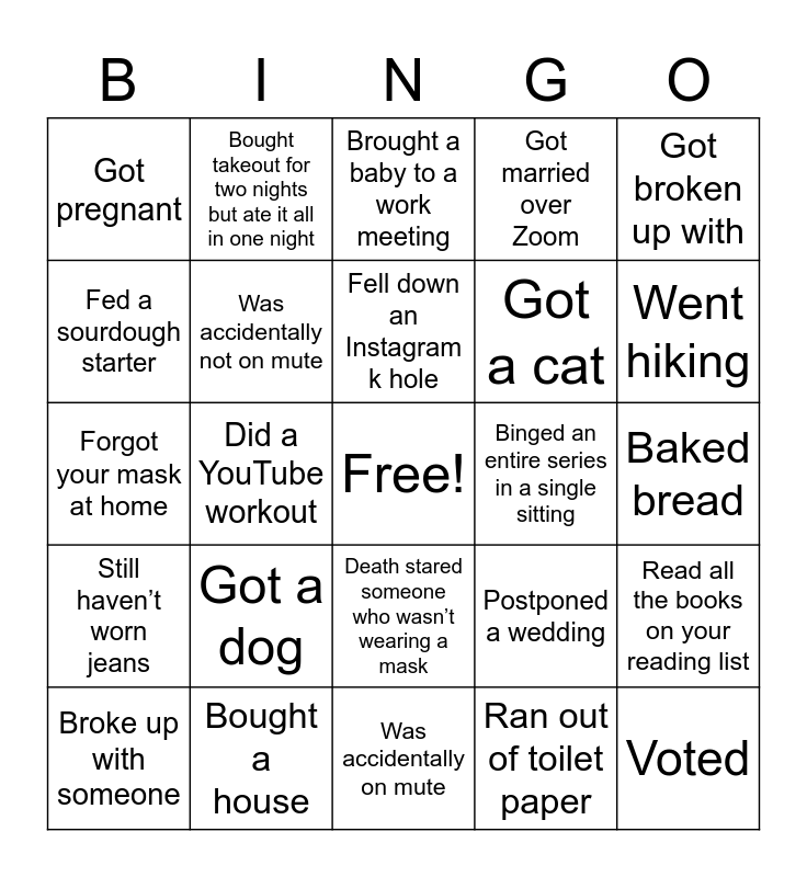 This bingo card has a free space and 29 words: Broke up with someone, Bought an air purifier, Did a YouTube workout, Started a new hobby, Got pregnant, Brought a baby to a work meeting, Was accidentally not on mute, Got a dog, Binged an entire series in a single sitting, Bought a house, Baked bread, Voted, Was accidentally on mute, Ran out of toilet paper, Went hiking, Bought more than five plants, Death stared someone who wasn’t wearing a mask, Still haven’t worn jeans, Got broken up with, Forgot your mask at home, Postponed a wedding, Hoarded emergency rations, Got a cat, Fed a sourdough starter, Got married over Zoom, Bought takeout for two nights but ate it all in one night, Read all the books on your reading list, Fell down an Instagram k hole and Bought a Peloton.