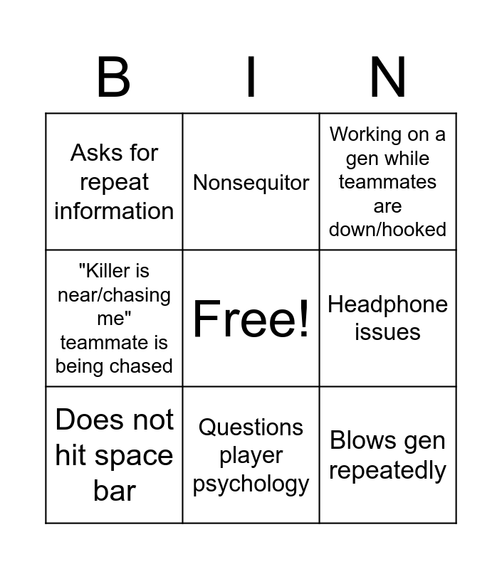 This bingo card has a free space and 8 words: Headphone issues, Working on a gen while teammates are down/hooked, Nonsequitor, Does not hit space bar, Asks for repeat information, Blows gen repeatedly, "Killer is near/chasing me" teammate is being chased and Questions player psychology.