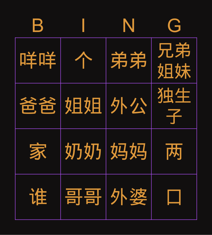 This bingo card has 19 words: 妈妈, 爷爷, 弟弟, 口, 两, 爸爸, 外婆, 咩咩, 个, 家, 奶奶, 姐姐, 外公, 哥哥, 谁, 家人, 兄弟姐妹, 独生子 and 独生奴.