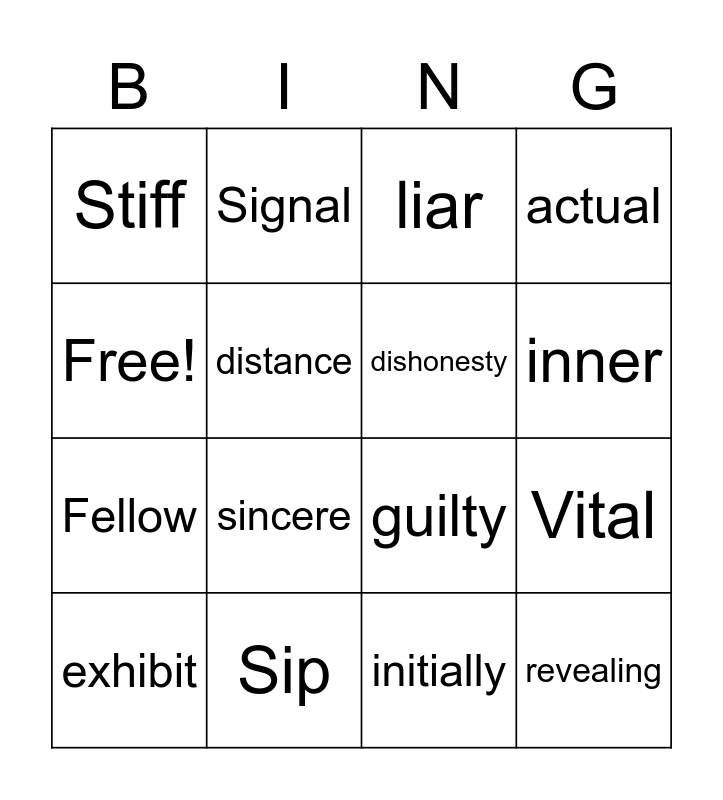This bingo card has 16 words: Sip, Vital, liar, Stiff, Fellow, Signal, guilty, initially, Free!, distance, exhibit, actual, sincere, inner, dishonesty and revealing.
