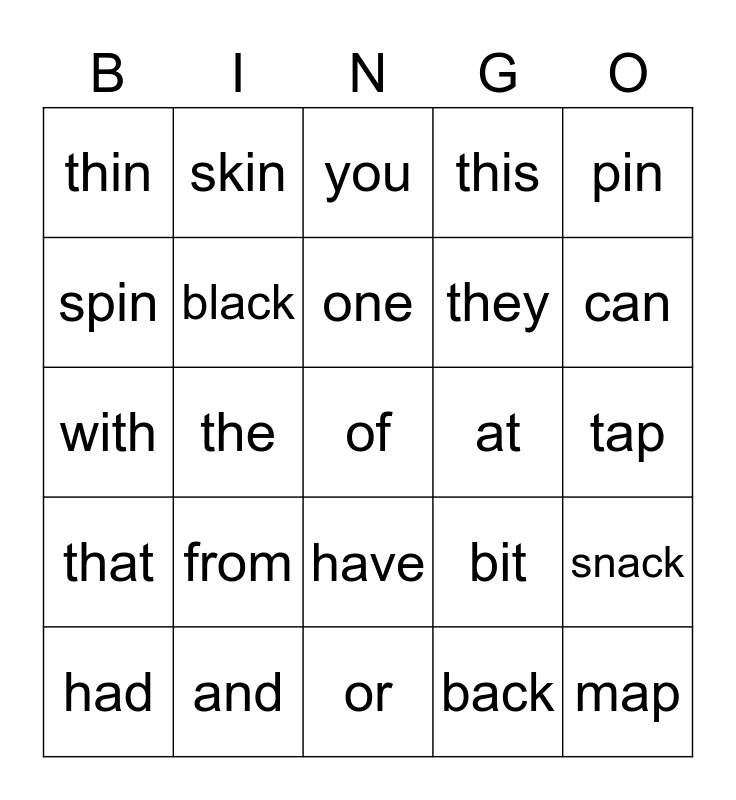 This bingo card has 25 words: from, or, one, had, pin, thin, spin, skin, at, have, they, with, bit, snack, black, map, tap, you, can, the, of, and, that, this and back.