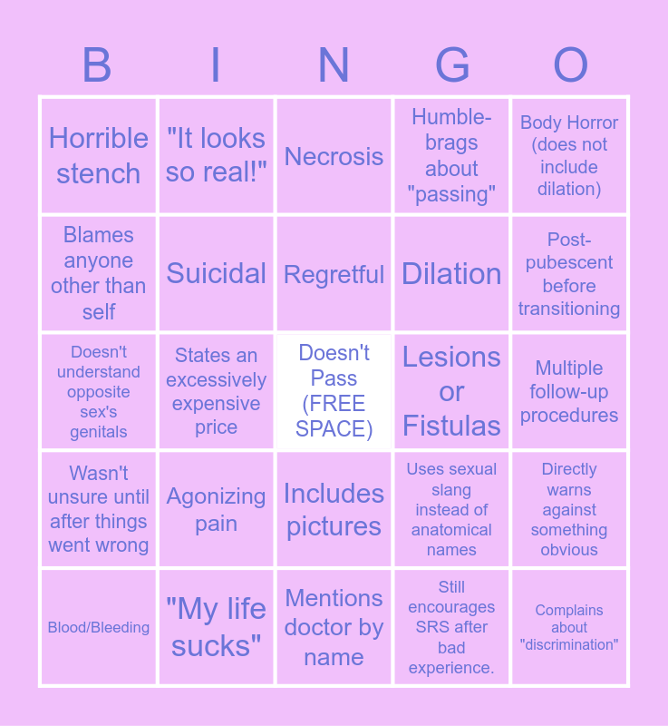 This bingo card has a free space and 38 words: Horrible results excused or ignored by comments, """Girlfriend""", "Mommy/daddy will take care of it", Suicidal, Directly warns against something obvious, Agonizing pain, Regretful, Mentions urination/defecation, Body Horror (does not include dilation), Dilation, States an excessively expensive price, Humble-brags about "passing", Complains about "discrimination", Multiple follow-up procedures, Blames anyone other than self, Wasn't unsure until after things went wrong, "I THOUGHT I WAS DOING EVERYTHING RIGHT", Necrosis, Proud Flesh, Lesions or Fistulas, Horrible stench, "My life sucks", Post-pubescent before transitioning, Blood/Bleeding, Flew out of state/country for procedure, Mentions doctor by name, Doesn't blame self, "Disabled" (includes mental disorders), Anime/feminine username, Comments missing, disabled, or patronizing, Mentions "no sensation," "nerves," or "depth", Includes pictures, Still encourages SRS after bad experience., "It looks so real!", Pushes estimated recovery time back, Uses sexual slang instead of anatomical names, Doesn't understand opposite sex's genitals and Excuses bad results by comparing to rare medical cases.