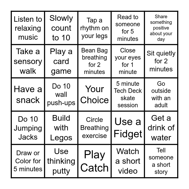 This bingo card has a free space and 24 words: Build with Legos, Use thinking putty, Bean Bag breathing for 2 minutes, Draw or Color for 5 minutes, Share something positive about your day, Listen to relaxing music, Take a sensory walk, Slowly count to 10, 5 minute Tech Deck skate session, Circle Breathing exercise, Close your eyes for 1 minute, Have a snack, Use a Fidget, Get a drink of water, Play a card game, Watch a short video, Go outside with an adult, Tap a rhythm on your legs, Sit quietly for 2 minutes, Do 10 wall push-ups, Tell someone a short story, Do 10 Jumping Jacks, Read to someone for 5 minutes and Play Catch.