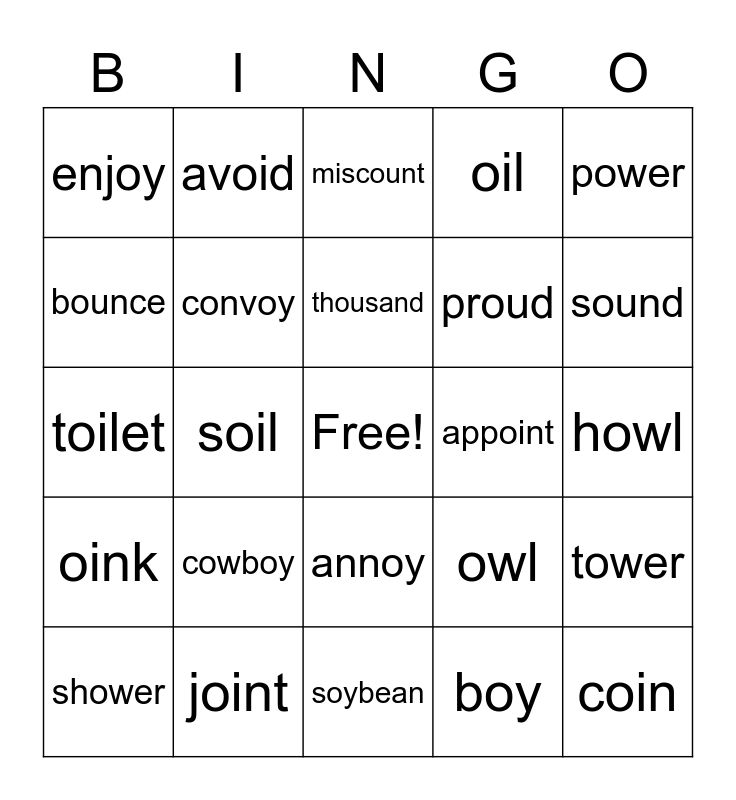 This bingo card has a free space and 24 words: cowboy, joint, thousand, shower, power, enjoy, bounce, avoid, appoint, annoy, proud, toilet, owl, tower, convoy, boy, howl, miscount, sound, soil, coin, oink, oil and soybean.