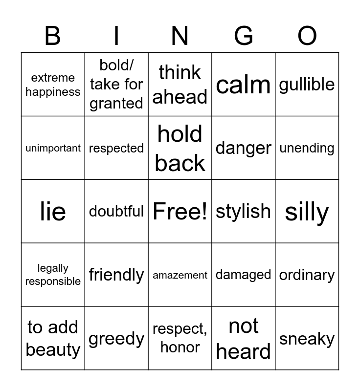 This bingo card has a free space and 29 words: to add beauty, stubborn, doubtful, boldness, extreme happiness, think ahead, respected, friendly, stylish, greedy, silly, sneaky, respect, honor, not heard, unending, act on feeling, amazement, legally responsible, gullible, lie, damaged, controlling/ harsh, danger, unimportant, calm, bold/ take for granted, ordinary, hold back and become smaller.