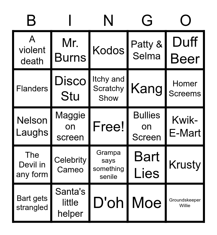 This bingo card has a free space and 25 words: Celebrity Cameo, D'oh, Itchy and Scratchy Show, Bart gets strangled, Duff Beer, A violent death, Flanders, Mr. Burns, Bullies on Screen, Grampa says something senile, Kang, Nelson Laughs, Bart Lies, Krusty, Disco Stu, Dr. Hibbert, Kwik-E-Mart, Kodos, Homer Screems, Maggie on screen, Groundskeeper Willie, Santa's little helper, The Devil in any form, Patty & Selma and Moe.