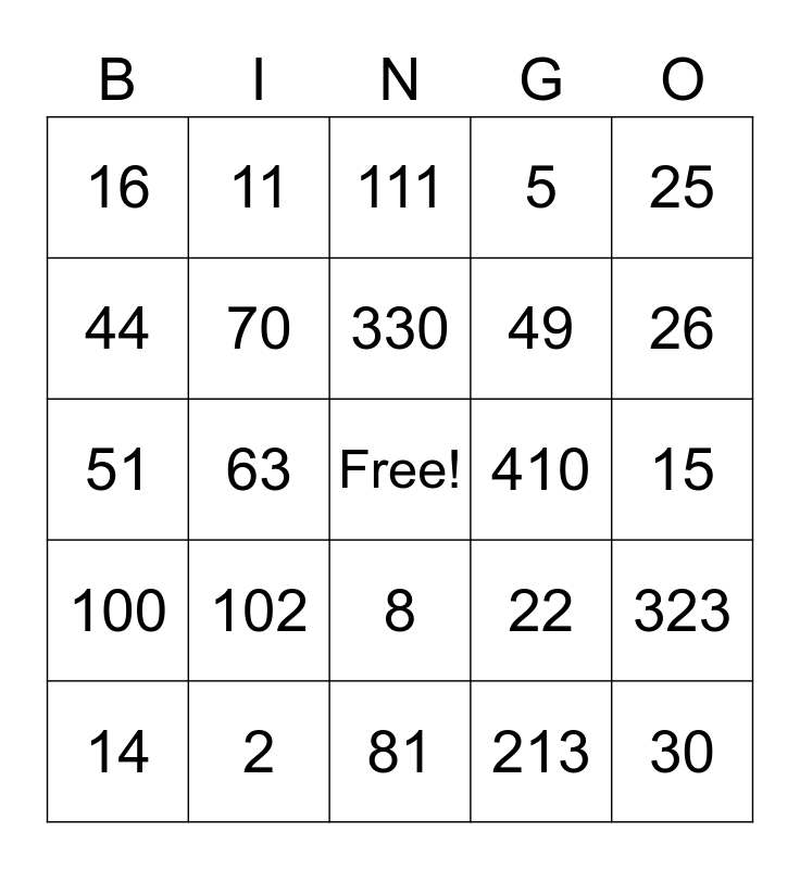 This bingo card has a free space and 24 words: 102, 2, 330, 14, 25, 16, 44, 11, 410, 8, 49, 51, 22, 323, 70, 213, 15, 111, 26, 63, 30, 100, 5 and 81.