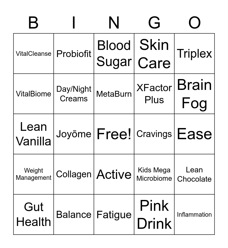 This bingo card has a free space and 26 words: Active, Pink Drink, MetaBurn, Balance, Triplex, VitalCleanse, VitalBiome, Probiofit, Ease, Kids Mega Microbiome, XFactor Plus, Lean Vanilla, Lean Chocolate, Gut Health, Joyōme, Nutrition, Skin Care, Weight Management, Blood Sugar, Inflammation, Brain Fog, Fatigue, Cravings, Collagen, Day/Night Creams and Health Journey.