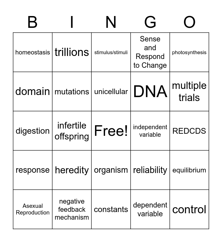 This bingo card has a free space and 29 words: Asexual Reproduction, Sexual Reproduction, infertile offspring, metabolism, homeostasis, stimulus/stimuli, mutations, heredity, independent variable, negative feedback mechanism, REDCDS, control, constants, dependent variable, multiple trials, cells, organism, response, photosynthesis, digestion, reliability, hypothesis, DNA, domain, Sense and Respond to Change, trillions, equilibrium, unicellular and defects.