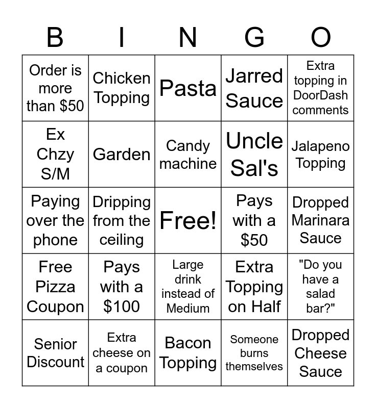 This bingo card has a free space and 40 words: "Do you deliver?", Paying over the phone, Half specialty and Half specialty pizza, Garden, Extra cheese on a coupon, Large drink instead of Medium, Candy machine, Dropped pizza, Extra topping in DoorDash comments, Free Pizza Coupon, Dripping from the ceiling, Jarred Sauce, Dropped Cheese Sauce, Dropped Marinara Sauce, Pays with a $50, Pays with a $100, Order is less than $1, Order is more than $50, Angry Customer, Pasta, "Do you have a salad bar?", Someone burns themselves, Uncle Sal's, Ex Chzy S/M, Chicago, Perfect, Ex Chzy Superoni, Motherlode, Motheroni, Works, Meatworks, Senior Discount, "Do you have any coupons?", Extra Topping on Half, Jalapeno Topping, Bacon Topping, Canadian Bacon Topping, Pineapple Topping, Chicken Topping and Green Olives Topping.