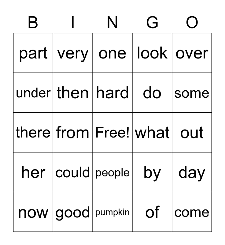 This bingo card has a free space and 24 words: could, good, hard, now, over, part, under, very, what, people, do, there, by, day, then, of, out, one, some, from, come, her, look and pumpkin.