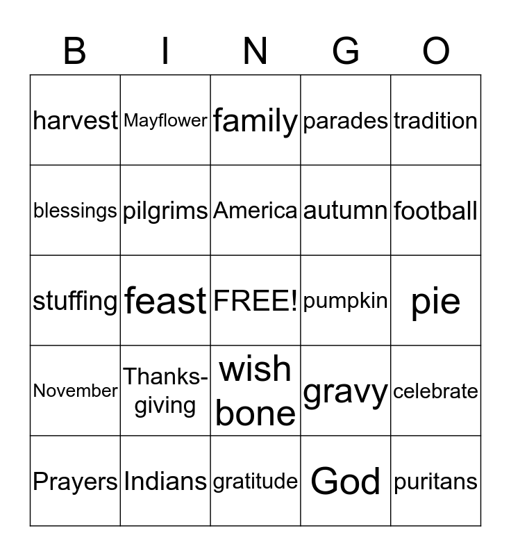 This bingo card has a free space and 24 words: Thanks-giving, Indians, America, Prayers, tradition, harvest, blessings, Mayflower, pumpkin, wish bone, autumn, stuffing, gravy, celebrate, pilgrims, God, pie, family, football, feast, puritans, November, parades and gratitude.