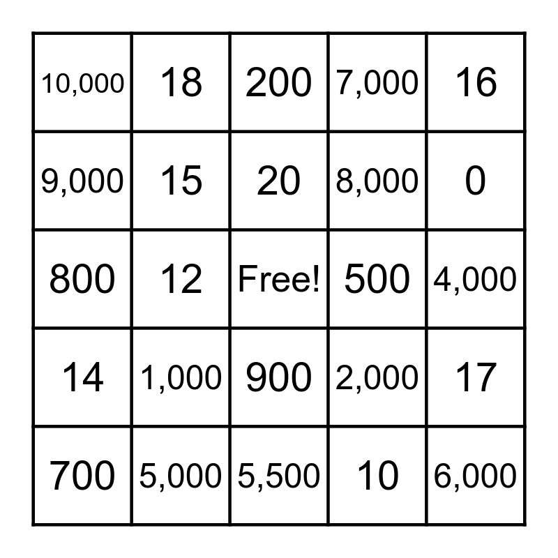 This bingo card has a free space and 32 words: 10, 11, 12, 13, 14, 15, 16, 17, 18, 19, 20, 200, 300, 400, 500, 600, 700, 800, 900, 1,000, 2,000, 3,000, 4,000, 5,000, 6,000, 7,000, 8,000, 9,000, 10,000, 5,500, 650 and 0.