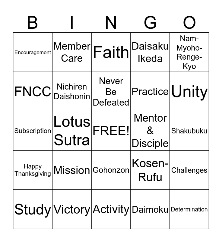 This bingo card has a free space and 24 words: Mission, Victory, Never Be Defeated, Study, Nam-Myoho-Renge-Kyo, Encouragement, FNCC, Member Care, Mentor & Disciple, Gohonzon, Practice, Subscription, Kosen-Rufu, Challenges, Nichiren Daishonin, Daimoku, Shakubuku, Faith, Unity, Lotus Sutra, Determination, Happy Thanksgiving, Daisaku Ikeda and Activity.