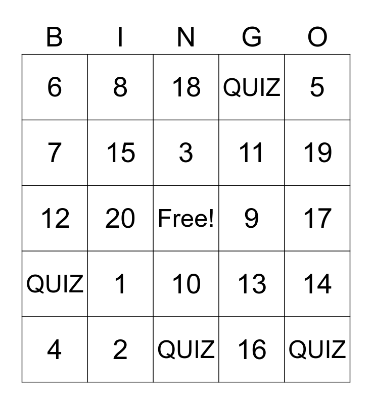 This bingo card has a free space and 24 words: 1, 2, 3, 4, 5, 6, 7, 8, 9, 10, 11, 12, 13, 14, 15, 16, 17, 18, 19, 20, QUIZ, QUIZ, QUIZ and QUIZ.