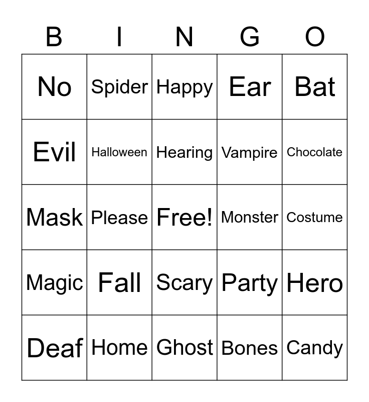 This bingo card has a free space and 30 words: Home, Thank you, Please, Yes, No, Happy, Halloween, Scary, Monster, Ghost, Costume, Candy, Bones, Pumpkin, Chocolate, Cat, Party, Magic, Fall, Bat, Mask, Witch, Spider, Vampire, Evil, Ear, Hero, Deaf, Hearing and Mouth.