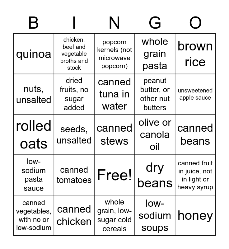 This bingo card has 26 words: Free!, low-sodium soups, canned tuna in water, canned chicken, brown rice, quinoa, nuts, unsalted, chicken, beef and vegetable broths and stock, canned beans, dry beans, peanut butter, or other nut butters, rolled oats, canned fruit in juice, not in light or heavy syrup, canned vegetables, with no or low-sodium, seeds, unsalted, shelf stable milk and milk substitutes, whole grain pasta, low-sodium pasta sauce, popcorn kernels (not microwave popcorn), canned stews, unsweetened apple sauce, whole grain, low-sugar cold cereals, olive or canola oil, canned tomatoes, dried fruits, no sugar added and honey.