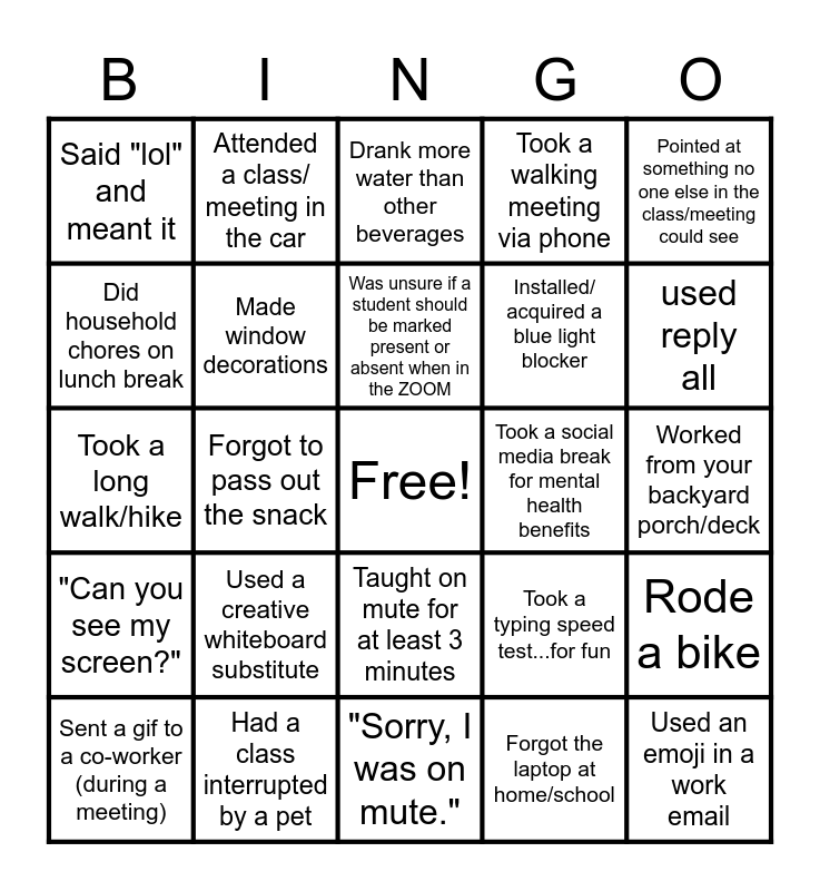 This bingo card has a free space and 54 words: Wore pjs/sweats bottoms to a video meeting, "Can you see my screen?", Set up "work hours" #worklifebalance, Did eye strain relief exercises, Taught on mute for at least 3 minutes, Created a makeshift "standing desk", Took a walking meeting via phone, "Can you hear me?", Did household chores on lunch break, Joked about how long your "commute" was, Said "lol" and meant it, Had a class interrupted by a family member, Had a class interrupted by a pet, Sent a gif to a co-worker (during a meeting), Took a coffee break...or three, "Sorry, I was on mute.", Used an emoji in a work email, Installed/ acquired a blue light blocker, Did chair yoga, Worked from your backyard porch/deck, Took a typing speed test...for fun, Created a workday playlist, Took a social media break for mental health benefits, Pointed at something no one else in the class/meeting could see, Sighed heavily when you realized your assignment didn't post, Attended a class/ meeting in the car, Made a healthy eating commitment (didn't say you kept it), Binged a series on Netflix/Hulu, Went a loooong time without showering (Who'd know?), Forgot the laptop at home/school, Forgot the Chromebook at home/school, Forgot lunch at home, Forgot... and never remembered what it was, Had "technical difficulties", Drank more water than other beverages, Read a book for pleasure, Took a long walk/hike, Rode a bike, Worked out between ZOOMs, Made window decorations, Tried new recipes, Forgot the mask at home, Checked in successfully in Navigate Prepared, Sneezed and looked around worriedly for other's reactions, Used a creative whiteboard substitute, Had an adult beverage during daylight hours (but not work hours), Marked a present student absent, Marked an absent student present, Was unsure if a student should be marked present or absent when in the ZOOM, Forgot to pass out the snack, used reply all, Hung quarantine lights, Hoarded toilet paper and Ran out of toilet paper.