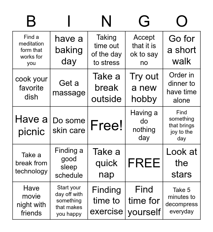 This bingo card has a free space and 25 words: Finding a good sleep schedule, Finding time to exercise, Take a break outside, Have movie night with friends, Go for a short walk, Find a meditation form that works for you, cook your favorite dish, have a baking day, Having a do nothing day, Take a quick nap, Try out a new hobby, Have a picnic, FREE, Look at the stars, Get a massage, Do some cleaning, Find something that brings joy to the day, Taking time out of the day to stress, Order in dinner to have time alone, Do some skin care, Take 5 minutes to decompress everyday, Start your day off with something that makes you happy, Take a break from technology, Accept that it is ok to say no and Find time for yourself.