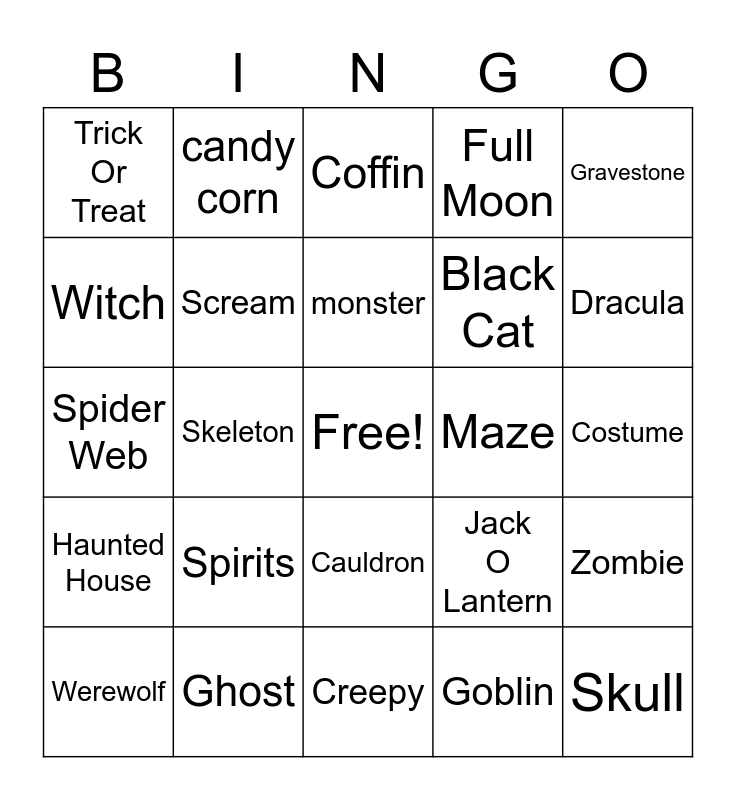 This bingo card has a free space and 24 words: Spirits, Ghost, monster, Werewolf, Gravestone, Trick Or Treat, Witch, candy corn, Maze, Cauldron, Black Cat, Spider Web, Jack O Lantern, Zombie, Scream, Goblin, Costume, Coffin, Dracula, Skeleton, Skull, Haunted House, Full Moon and Creepy.