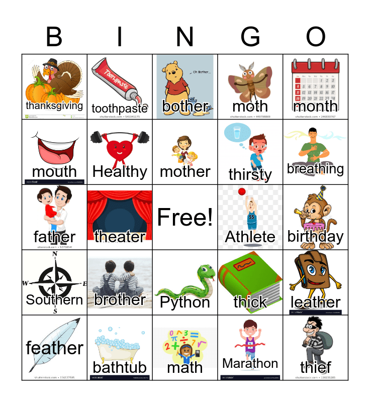 This bingo card has 24 images, a free space and 24 words: brother, bathtub, mother, feather, month, thanksgiving, mouth, toothpaste, Athlete, Python, thirsty, father, thick, leather, Healthy, Marathon, birthday, bother, breathing, theater, thief, Southern, moth and math.