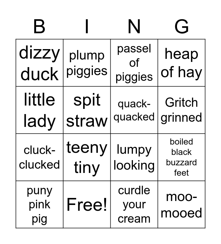 This bingo card has 22 words: Free!, piggie pie, plump piggies, still smoking, spit straw, quack-quacked, dizzy duck, passel of piggies, lumpy looking, moo-mooed, cluck-clucked, heap of hay, milk machine, seed spreader, curdle your cream, grouchy grumpy, boiled black buzzard feet, puny pink pig, teeny tiny, little lady, Gritch grinned and arm in arm.