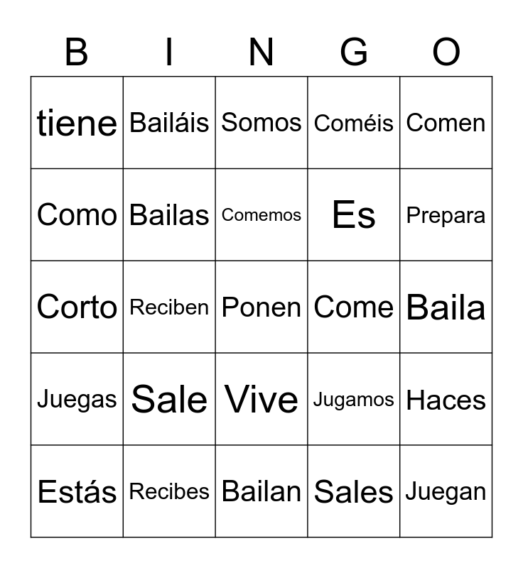 This bingo card has 73 words: tengo, tienes, tiene, tenemos, Tenéis, Juego, Juegas, Juega, Jugamos, Jugáis, Juegan, Bailo, Bailas, Baila, Bailamos, Bailáis, Bailan, Como, Comes, Come, Comemos, Coméis, Comen, Estoy, Estás, Está, Estamos, Estáis, Están, Recibo, Recibes, Recibe, Recibimos, Recibís, Reciben, Pongo, Pones, Pone, Ponen, Salgo, Sales, Sale, Salen, Soy, Eres, Es, Somos, Sois, Son, Corto, Cortas, Corta, Cortamos, Cortáis, Cortan, Vivo, Vives, Vive, Vivimos, Vivís, Viven, Prepare, Preparas, Prepara, Preparamos, Praparáis, Preparan, Hago, Haces, Hace, Hacemos, Hacéis and Hacen.