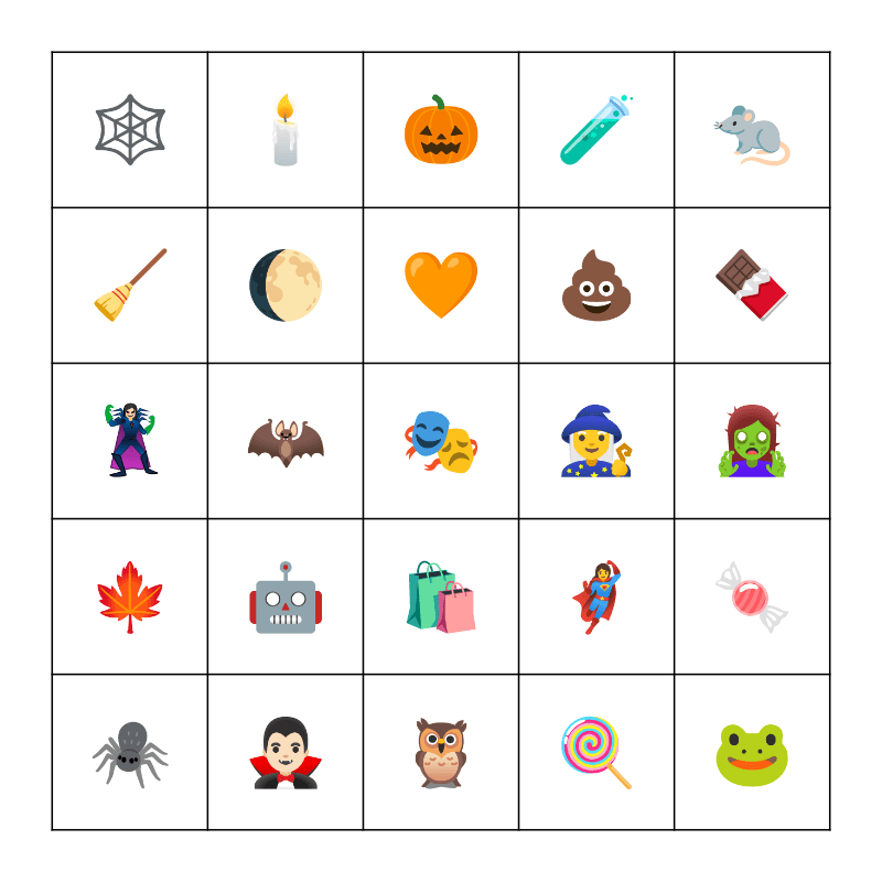 This bingo card has a free space and 29 words: ๐ท, ๐ป, ๐ฆ, โ ๏ธ, ๐ธ, ๐, ๐, ๐ค, ๐งโโ๏ธ, ๐ง๐ปโโ๏ธ, ๐งโโ๏ธ, ๐ธ, ๐ฆ, ๐ญ, ๐ซ, ๐ฎ, ๐, ๐, ๐, ๐ฆน๐ปโโ๏ธ, ๐ฆธโโ๏ธ, ๐, ๐ฉ, ๐งน, ๐งช, ๐ฏ, ๐ฌ, ๐งก and ๐ค.