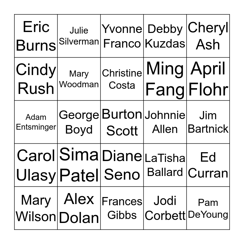 ⚠ This card has duplicate items: Johnnie Allen (2), Cheryl Ash (2), Helene Berns (2), George Boyd (2), Jodi Corbett (2), Ed Curran (2), Pat Dalton (2), Alex Dolan (2), Cathy Elfstrand (2), Adam Entsminger (2), Ming Fang (2), April Flohr (2), Yvonne Franco (2), Colleen Frankowski (2), Robin Gallagher (2), Lindsay Gerke (2), Frances Gibbs (2), Mary Halatek (2), Pam DeYoung (2)