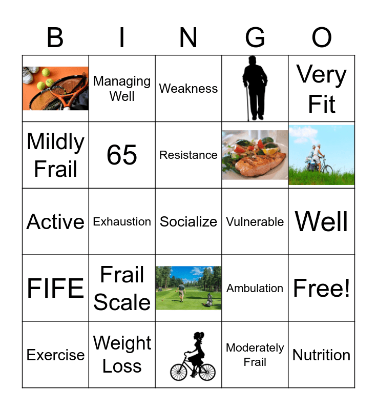 This bingo card has 7 images and 19 words: Moderately Frail, Resistance, Weight Loss, Very Fit, Mildly Frail, Managing Well, Well, Ambulation, Active, Free!, Exercise, Exhaustion, FIFE, Weakness, Socialize, Vulnerable, Frail Scale, 65 and Nutrition.