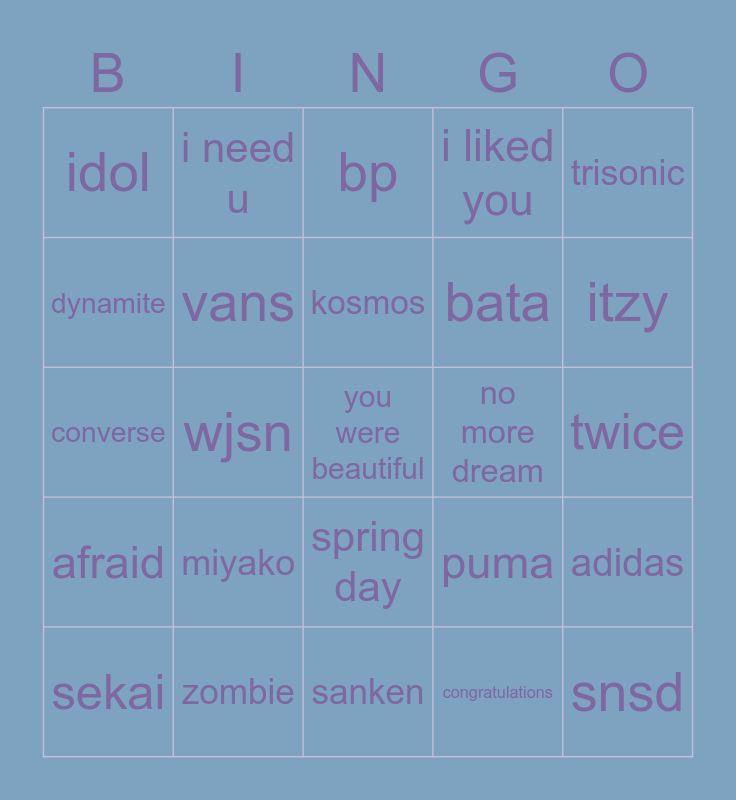 This bingo card has 25 words: miyako, sanken, kosmos, sekai, trisonic, idol, dynamite, i need u, no more dream, spring day, bata, converse, puma, adidas, vans, snsd, twice, bp, itzy, wjsn, you were beautiful, zombie, afraid, i liked you and congratulations.