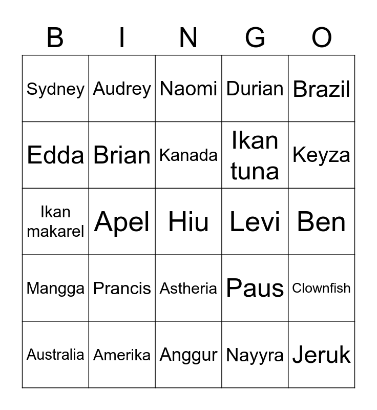 This bingo card has a free space and 24 words: Prancis, Amerika, Kanada, Australia, Brazil, Sydney, Edda, Audrey, Levi, Astheria, Ikan tuna, Ikan makarel, Paus, Clownfish, Brian, Nayyra, Ben, Naomi, Keyza, Apel, Jeruk, Mangga, Durian and Anggur.
