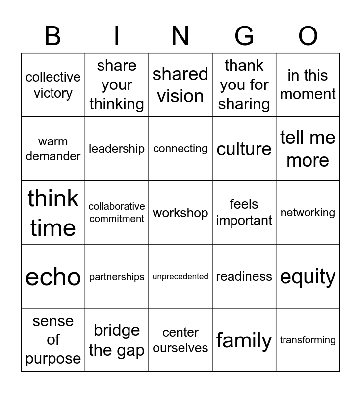 This bingo card has 25 words: partnerships, center ourselves, connecting, sense of purpose, in this moment, collective victory, warm demander, share your thinking, feels important, unprecedented, culture, think time, readiness, equity, leadership, transforming, networking, shared vision, tell me more, collaborative commitment, workshop, bridge the gap, echo, thank you for sharing and family.