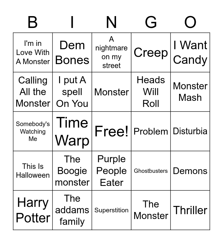 This bingo card has a free space and 24 words: The Boogie monster, The addams family, Monster, Harry Potter, I Want Candy, I'm in Love With A Monster, Calling All the Monster, Dem Bones, Problem, Purple People Eater, Heads Will Roll, Somebody's Watching Me, Ghostbusters, Demons, I put A spell On You, The Monster, Disturbia, A nightmare on my street, Monster Mash, Time Warp, Thriller, This Is Halloween, Creep and Superstition.