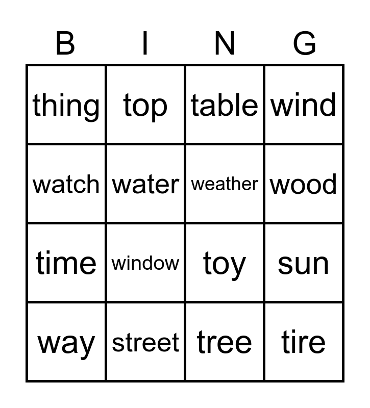This bingo card has 16 words: street, sun, table, thing, time, top, toy, tree, watch, water, way, wind, window, wood, weather and tire.