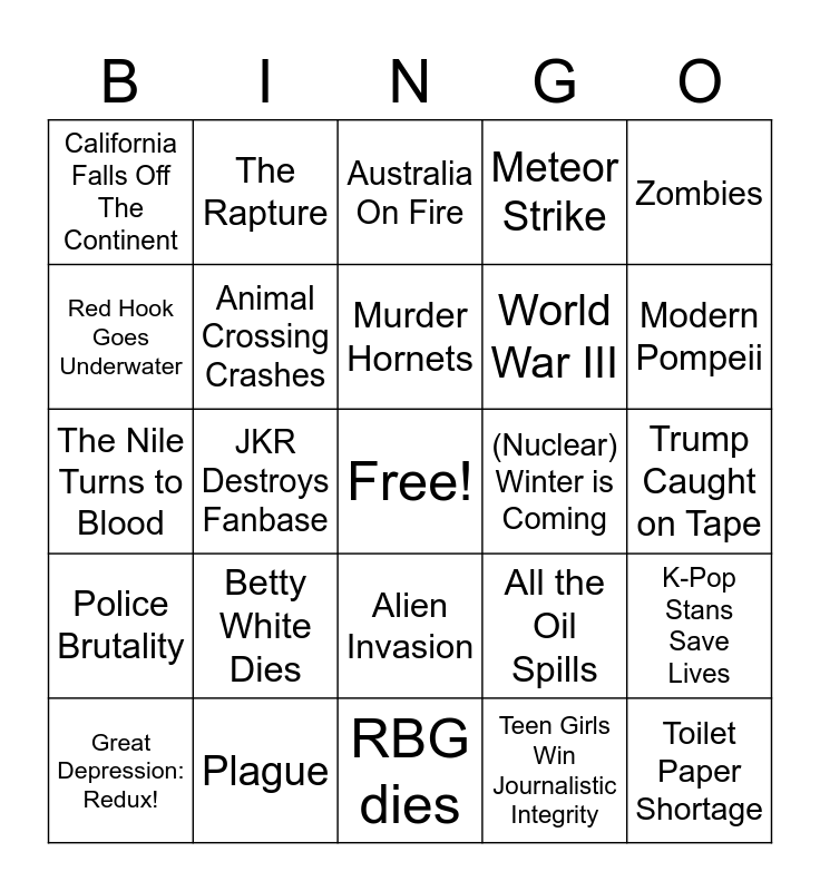 This bingo card has a free space and 24 words: Betty White Dies, Plague, Murder Hornets, Great Depression: Redux!, Zombies, California Falls Off The Continent, Red Hook Goes Underwater, The Rapture, (Nuclear) Winter is Coming, Alien Invasion, World War III, The Nile Turns to Blood, All the Oil Spills, K-Pop Stans Save Lives, Animal Crossing Crashes, Teen Girls Win Journalistic Integrity, Trump Caught on Tape, Australia On Fire, Modern Pompeii, JKR Destroys Fanbase, Toilet Paper Shortage, Police Brutality, Meteor Strike and RBG dies.