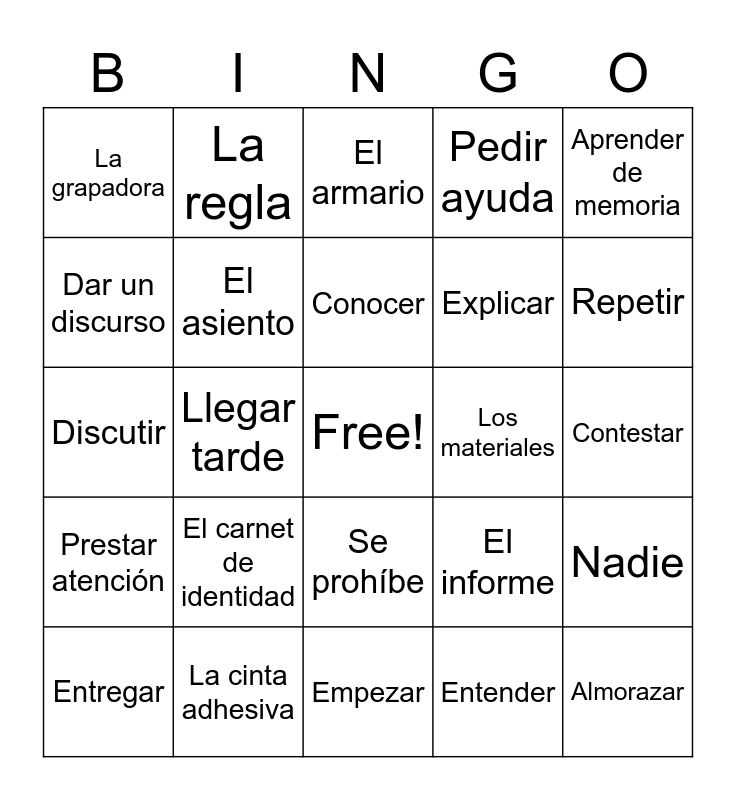 This bingo card has a free space and 29 words: Entregar, A tiempo, Llegar tarde, Las tijeras, La grapadora, El armario, El asiento, El carnet de identidad, Los materiales, La cinta adhesiva, Contestar, Almorazar, Empezar, Entender, Repetir, Sacar una buena nota, Se prohíbe, Prestar atención, Aprender de memoria, Discutir, El informe, El laboratorio, Explicar, Dar un discurso, Pedir ayuda, La regla, Nadie, Conocer and Respetar.
