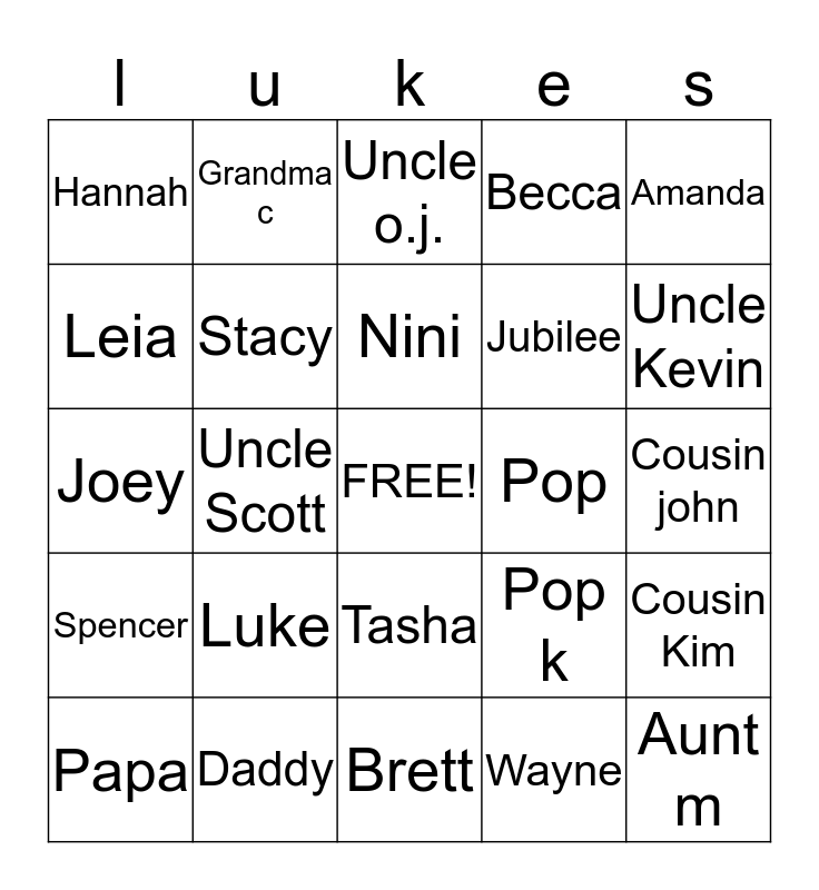 This bingo card has a free space and 24 words: Luke, Daddy, Nini, Papa, Amanda, Hannah, Leia, Grandma c, Pop, Tasha, Jubilee, Joey, Pop k, Cousin Kim, Stacy, Wayne, Cousin john, Uncle o.j., Uncle Kevin, Uncle Scott, Aunt m, Spencer, Becca and Brett.