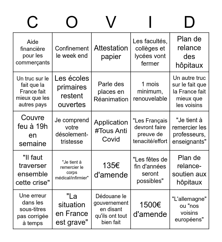 This bingo card has a free space and 24 words: "Je tient à remercier le corps médical/infirmier", "La situation en France est grave", Parle des places en Réanimation, Une erreur dans les sous-titres pas corrigée à temps, Plan de relance des hôpitaux, Aide financière pour les commerçants, Un truc sur le fait que la France fait mieux que les autres pays, Confinement le week end, "Les Français devront faire preuve de tenacité/effort, 135€ d'amende, 1 mois minimum, renouvelable, Couvre feu à 19h en semaine, "Les fêtes de fin d'années seront possibles", Plan de relance-soutien aux hôpitaux, Les écoles primaires restent ouvertes, 1500€ d'amende, "Je tient à remercier les professeurs, enseignants", Attestation papier, Un autre truc sur le fait que la France fait mieux que les voisins, Je comprend votre désolement-tristesse, "L'allemagne" ou "nos voisins européens", "Il faut traverser ensemble cette crise", Les facultés, collèges et lycées vont fermer and Dédouane le gouvernement en disant qu'ils ont tout bien fait.