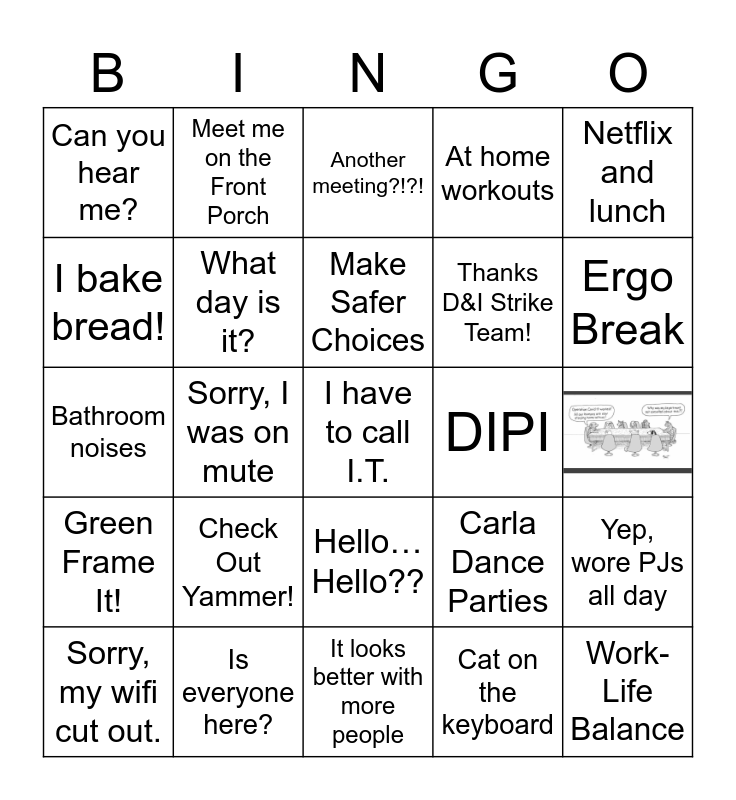 This bingo card has 2 images, a free space and 68 words: Please mute your phone!, Toilet Paper, Is everyone here?, Scroll Up, At home workouts, Slept in late, Netflix and lunch, “… you’re on mute!”, Yep, wore PJs all day, Can you see my screen?, Can you hear me?, Another meeting?!?!, Share your screen, Sorry, I was on mute, Hello…Hello??, Thanks D&I Strike Team!, REG AFFAIRS ROCKS!, Green Frame It!, DIPI, Carla Dance Parties, Ergo Break, Wellness Walk, Home Delivery, Grub Hub anyone?, But I’m not a teacher!, Barking dog, Cat on the keyboard, Robes… Skype appropriate!, Meet me on the Front Porch, WIFI (thank you!), Did you catch the Livestream?, Covid Beard, What’s TikTok?, Walk to the Moon, Fashionable facemasks, Can you see my screen?, Sorry, can you repeat that?, I bake bread!, Groundhog Day, Check Out Yammer!, Work-Life Balance, I love my commute!, Gratitude, What day is it?, Sorry, my wifi cut out., I was multitasking, can you repeat that?, (noise in the background)… hey, put that down!, Is my video working?, Is it too early for happy hour?, Furry friends in the background, Listen to my fav song, Meditate for 5 mins, It looks better with more people, Let's take this offline, Make Safer Choices, Holiday Season, ROCK STAR, Ground Rules, Bathroom noises, Heavy Breathing, Video chat with Family, Homeschool the kids, We’re in this together, Here to help, Time for fun, Digital Online learning, Go on a long drive and Game Changer.