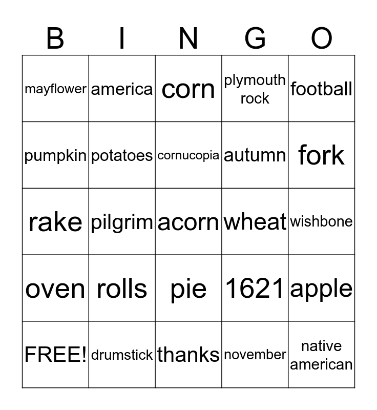 This bingo card has 29 words: FREE!, turkey, pilgrim, native american, mayflower, corn, potatoes, rolls, wheat, drumstick, wishbone, acorn, thanks, november, fork, knife, pie, oven, football, rake, 1621, feathers, autumn, pumpkin, plymouth rock, america, apple, cornucopia and farm.