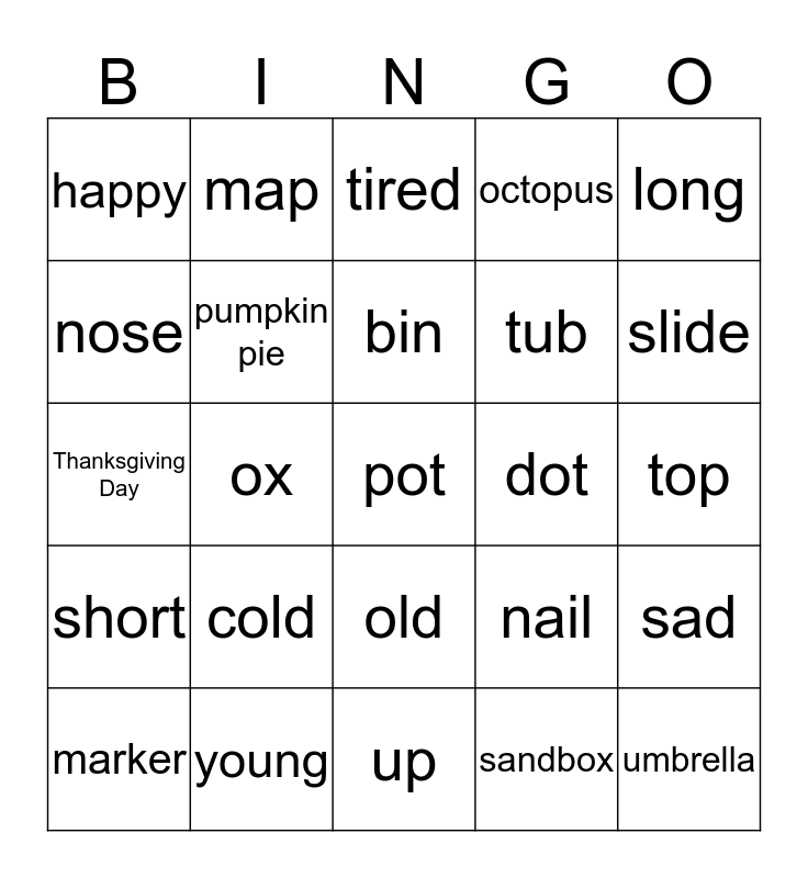 This bingo card has 41 words: FREE!, Thanksgiving Day, turkey, pumpkin pie, young, old, bin, small, long, short, ox, octopus, pot, top, dot, cold, hot, happy, hungry, tired, sad, umbrella, up, tub, cup, bug, sandbox, seesaw, slide, swing, mop, map, marker, nest, nail, nose, bench, pond, tree, picnic table and soccer field.