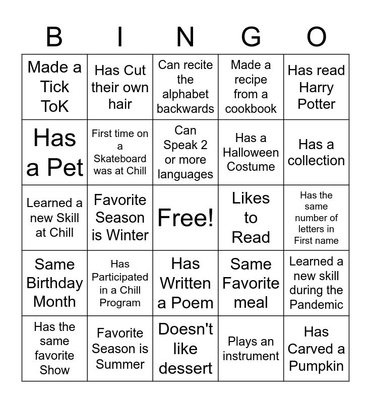 This bingo card has a free space and 24 words: Has Participated in a Chill Program, Favorite Season is Summer, Can Speak 2 or more languages, Has the same favorite Show, Has read Harry Potter, Made a Tick ToK, Has a Pet, Has Cut their own hair, Likes to Read, Has Written a Poem, Has a Halloween Costume, Learned a new Skill at Chill, Same Favorite meal, Learned a new skill during the Pandemic, First time on a Skateboard was at Chill, Plays an instrument, Has the same number of letters in First name, Can recite the alphabet backwards, Has a collection, Favorite Season is Winter, Has Carved a Pumpkin, Same Birthday Month, Made a recipe from a cookbook and Doesn't like dessert.